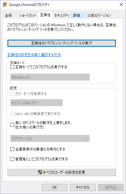 あんまり気にしないところだと思いますが 古いソフトでは互換性タブで設定してることがありました1709 でそこを見てみると